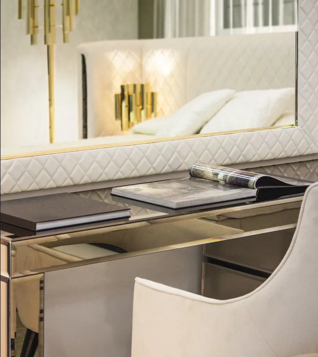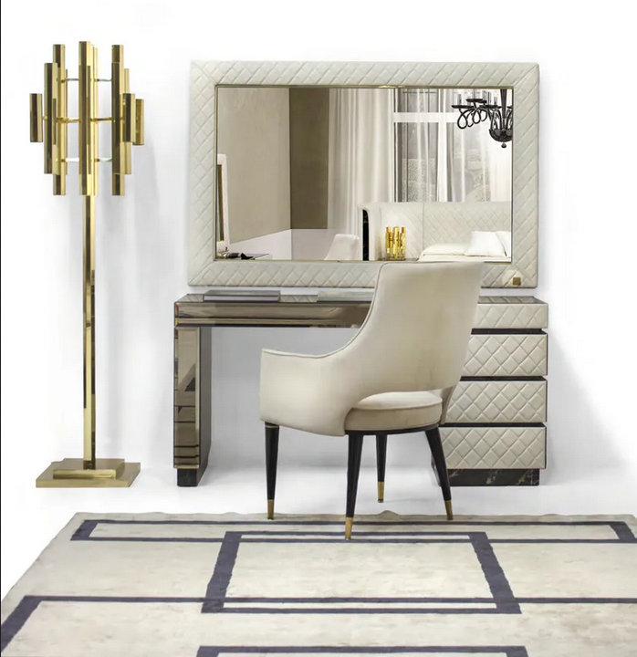 Chaque détail de la coiffeuse est soigneusement conçu pour garantir une esthétique captivante. Le motif matelassé élégant combiné à des coutures ton sur ton met en valeur un savoir-faire exquis. Le miroir en bronze ajoute une touche de glamour et de fonctionnalité, tandis que la base en marbre lisse offre stabilité et luxe. Dans l'ensemble, le design dégage sophistication, en faisant un ajout parfait aux intérieurs modernes.
