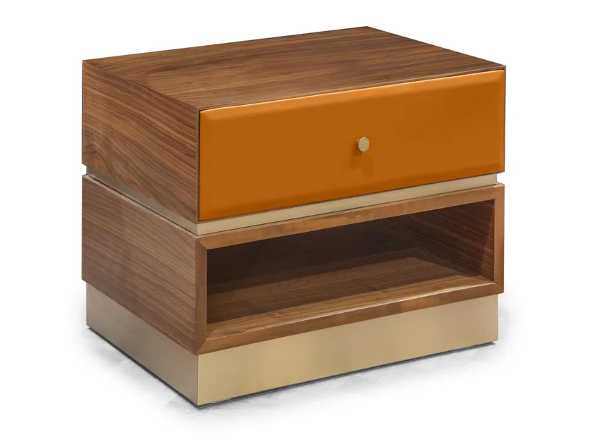 Cette table de chevet est construite en placage de bois de haute qualité, garantissant durabilité et longévité. Le cuir Cuoio utilisé pour le tiroir n'est pas seulement luxueux mais également écologique, respectant les normes de durabilité internationales. Les composants en métal présentent une finition sophistiquée, alliant attrait esthétique et résilience. La finition en cuir Cocco ajoute une touche raffinée, élevant le design général tout en assurant un entretien facile.