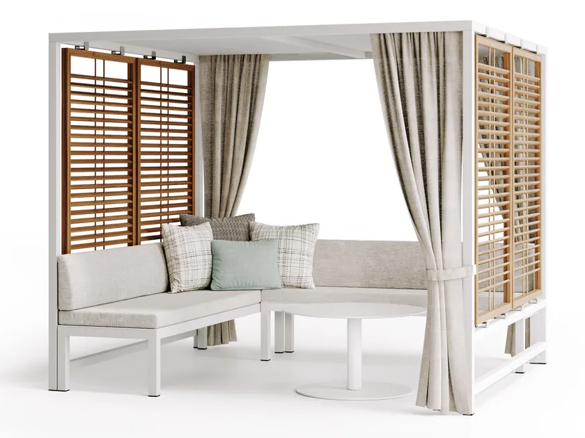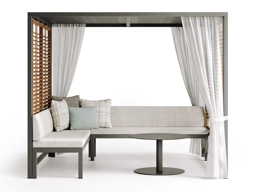 Le gazebo ALCOVA est conçu avec la fonctionnalité à l'esprit. Son aménagement spacieux offre suffisamment d'espace pour s'asseoir et socialiser, le rendant parfait pour les rassemblements. Les panneaux coulissants en teck peuvent être ajustés pour créer le niveau d'ombre souhaité, tandis que les rideaux offrent une protection supplémentaire contre les intempéries. Cette approche multifonctionnelle fait du gazebo un ajout polyvalent à tout espace extérieur.