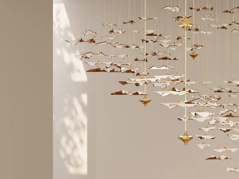 La lampe suspendue en porcelaine artisanale LED - Canopées en feuilles torsadées par HABERDASHERY est une pièce étonnante qui allie art et fonctionnalité. Cette lampe suspendue présente des feuilles en porcelaine délicates finies avec des glaçures luxueuses en or, blanc et vert, suspendues par des fils micro-fins. Son design unique crée une ambiance éthérée, la rendant parfaite pour les intérieurs modernes. Les downlights intégrés projettent des formes de feuillage subtiles sur les surfaces environnantes, rehaussant l'attrait esthétique global et offrant une lueur chaleureuse et accueillante.