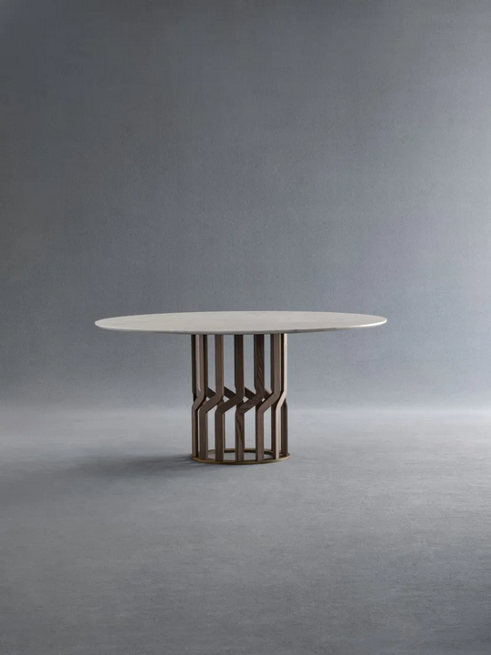 La table ronde en frêne possède un design captivant caractérisé par ses formes fluides et ses détails complexes. Les 14 éléments en bois massif de la base créent une silhouette visuellement frappante qui attire le regard. Le plateau circulaire lisse sert de surface accueillante pour les repas, tandis que la finition en marbre élégant ajoute une touche de luxe. Chaque aspect de cette table a été soigneusement conçu pour créer un look harmonieux et sophistiqué.