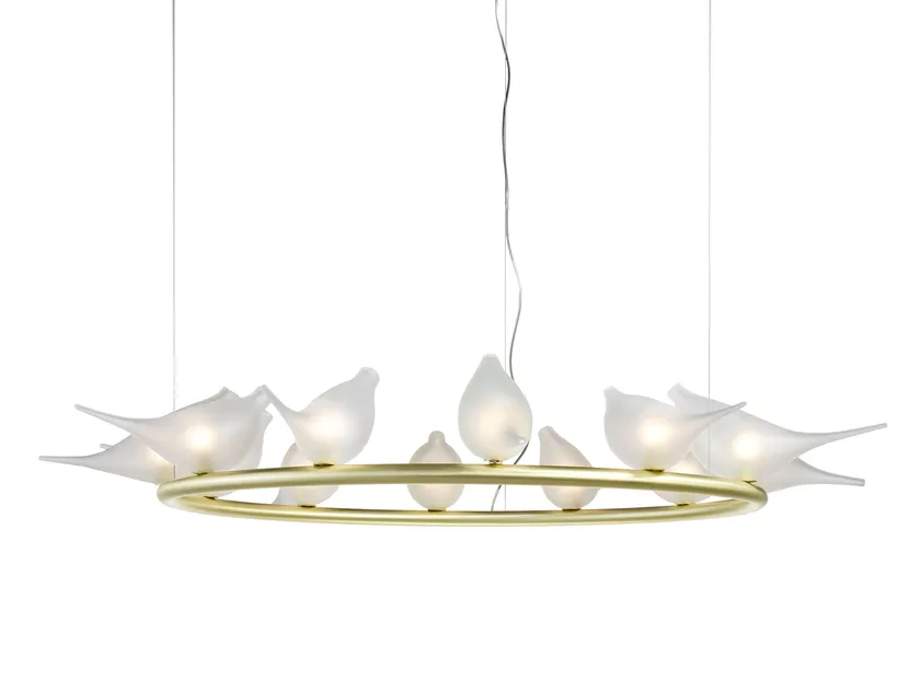 La lampe suspendue "Light of Love 12" comprend un luminaire complet avec 12 sources lumineuses individuelles, des colombes élégamment conçues et un support robuste en or brossé. Cette composition permet un affichage visuel captivant qui transforme toute pièce en un havre de luxe.