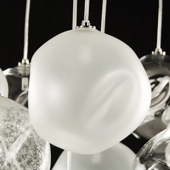 La Desafinado 38 présente un design unique caractérisé par ses formes organiques et fluides. Les délicates sphères en verre soufflé à la bouche pendent élégamment, créant un effet visuel captivant. L'attention méticuleuse portée aux détails, y compris les finitions polies et l'interaction des textures, élève son attrait esthétique, faisant d'elle une véritable pièce maîtresse pour n'importe quel foyer ou bureau.