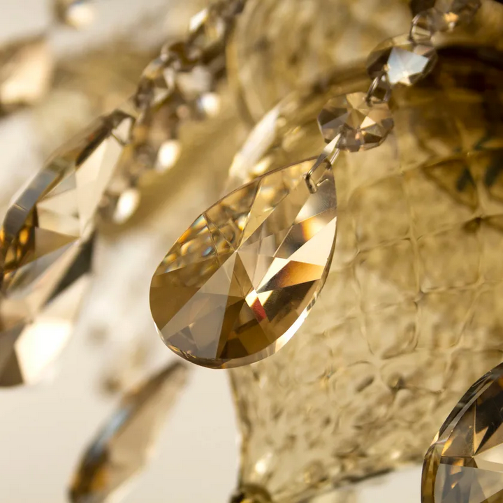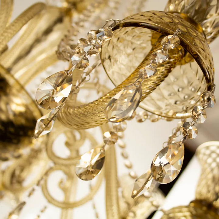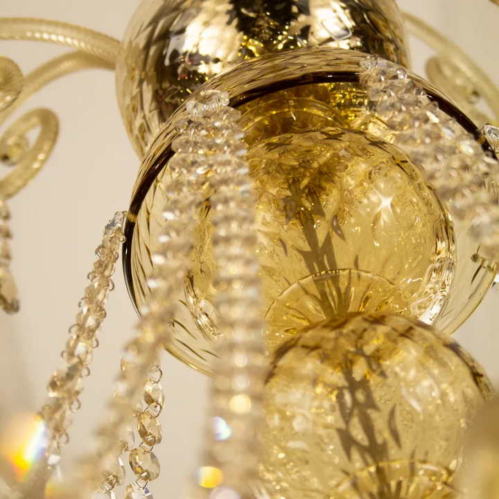 Ce lustre exquis est fabriqué à partir de verre soufflé de haute qualité et de cristal, garantissant à la fois durabilité et beauté. La finition Murano renforce son attrait luxueux, tandis que le polissage méticuleux des détails en métal crée un effet visuel époustouflant. Les matériaux utilisés sont écologiques et durables, conformes aux normes internationales pour garantir à la fois élégance et responsabilité environnementale.