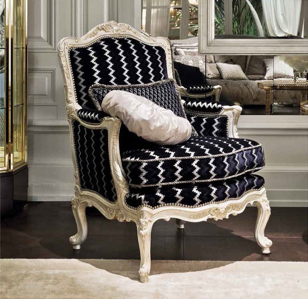 Fauteuil. Remplissage-polyuréthane. Décoré avec des éléments de massacre. D'autres options de rembourrage et de finition sont possibles.