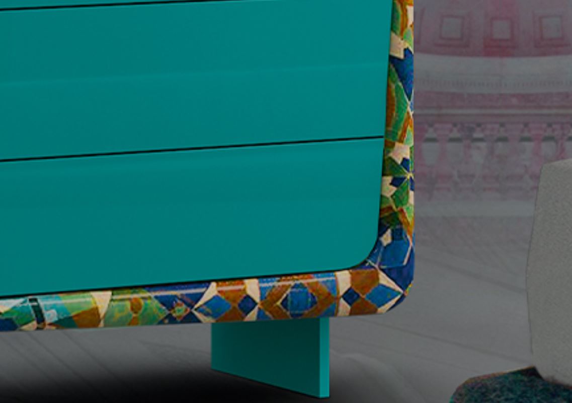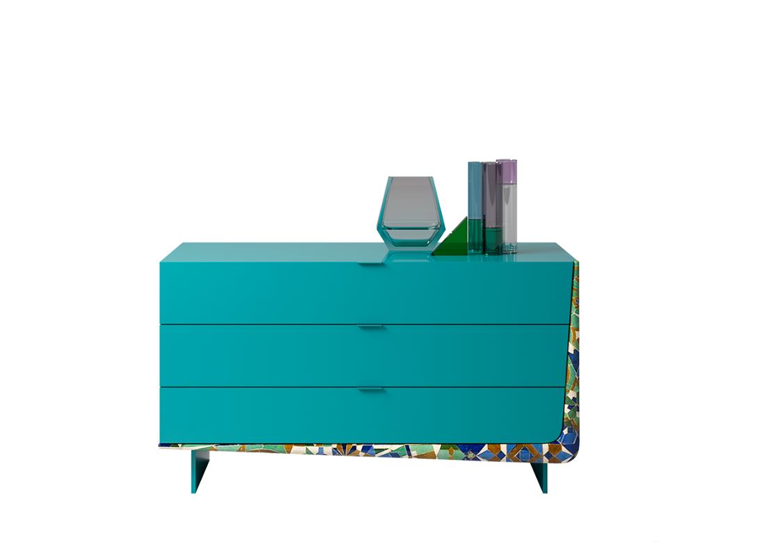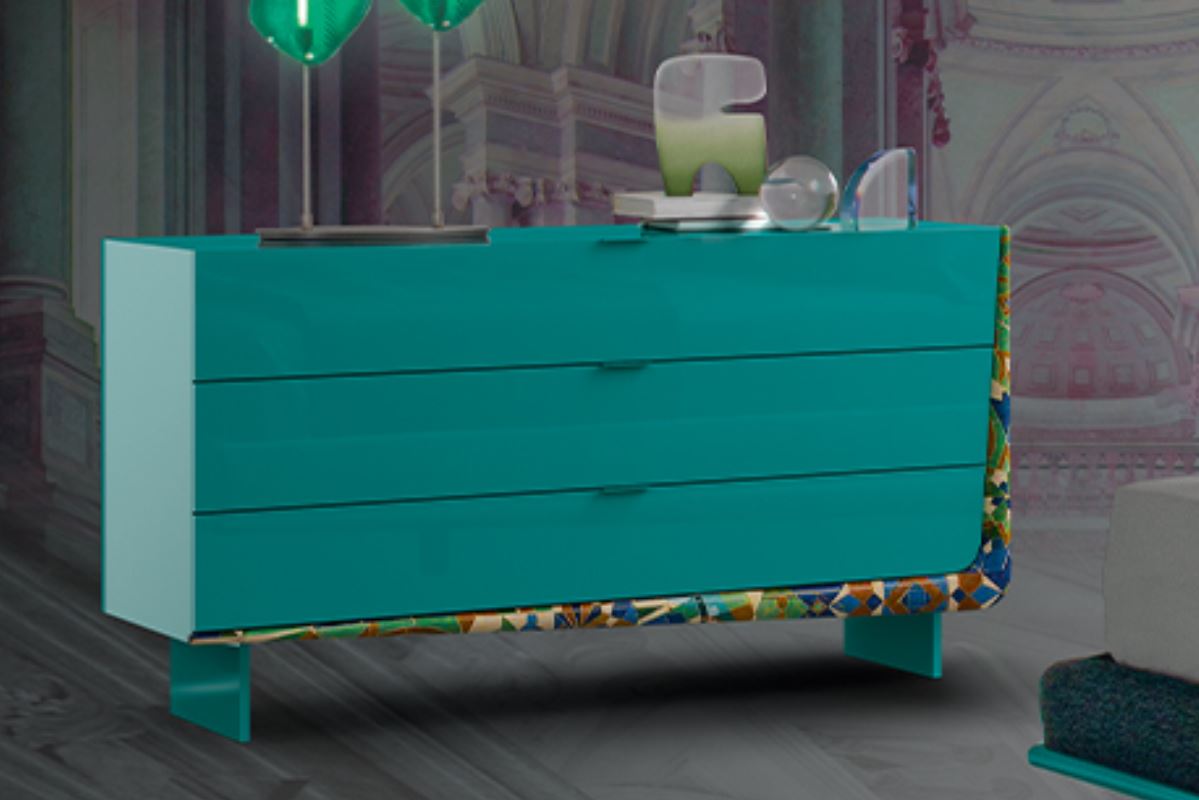 Développement de l'usine SIGNORINI COCO. Commode BOOMERANG manufacture DAYTONA collection WONDERLAND. Le cadre et les tiroirs sont en contreplaqué recouvert de MDF verni. Habillage des tiroirs, poignées en acier laqué.