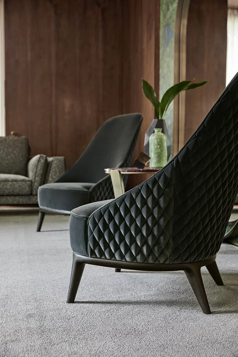 Le fauteuil LESLIE présente des détails de design exquis, y compris un matelassage en forme de diamant sur le revers du dossier. Les lignes courbes et les profils lisses améliorent son esthétique globale, tandis que la combinaison de tissu et de bois crée un look chaleureux et accueillant. L'attention portée aux détails est évidente dans chaque aspect de cette pièce magnifiquement fabriquée.